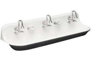 The Brockway wash sink offers a classic look with the durability of KOHLER Cast Iron. This wall-mount lavatory features drillings for three Cannock faucets and two Cannock soap dishes.