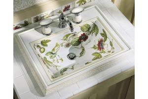 Inspired by 18th-century European botanical drawings, Crimson Topaz portrays brightly colored passionflowers intertwined with leaves and vines in shades of red and green on a White background. Here, scroll pattern in light mocha frames the floral design on the Memoirs self-rimming lavatory. This model features drillings for faucets with 8" centers.