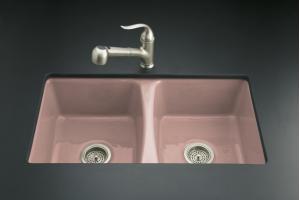 The Deerfield kitchen sink is a modern classic with deep, matching double basins. Constructed of durable KOHLER® Cast Iron, its clean, simple lines feature rounded corners and a graduated interior basin edge. This undercounter model features a five-hole faucet drilling.