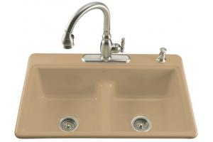 The cast iron sink shall be 33" (83.8 cm) in length, and 22" (55.9 cm) in width. Sink shall have an acid resistant enamel finish. Sink shall have an equal dimension double basin. Sink shall feature a low profile basin divider for ease of handling large items. Sink shall be available with two, three, four, or five holes for self-rimming installations or seven holes for undercounter installations. Sink shall be Kohler Model K-5838.