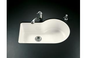 The Entree single-basin kitchen sink features a unique basin shape that's round on one side and square on the other. Its extra-deep basin creates a spacious work area that will accommodate your largest pots and pans. Constructed of durable KOHLER® Cast Iron, the Entree has a variety of customized accessory options to maximize workflow. This undercounter model features a two-hole oversized faucet drilling.