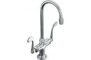 Two-handle entertainment sink faucet shall be of brass construction. Faucet shall feature brass valve bodies. Faucet shall feature quarter-turn washerless ceramic disc valves, assuring positive handle stop positioning. Faucet shall be rated at 2.5 gallons (9 L) per minute. Faucet shall have lower flow aerator options. Faucet shall include single-hole mounting, 5-1/2" (14 cm) gooseneck swing spout and wristblade handles. Optional escutcheon plate is available for three-hole installations. Faucet shall be Kohler Model K-8761.