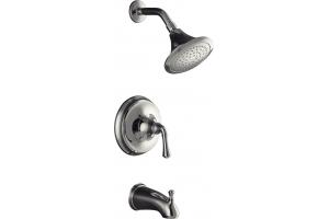 Rite-Temp pressure-balancing single-control bath and shower faucet trim shall be of metal construction. Bath and shower trim shall include showerhead with arm and flange, 5-1/4" (13.3 cm) diverter spout with NPT or slip-fit connection, and faceplate with handle. Rite-Temp valve OR K-306-KS-NA HiFlow Rite-Temp valve.