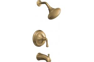 Rite-Temp pressure-balancing single-control bath and shower faucet trim shall be of metal construction. Bath and shower trim shall include showerhead with arm and flange, 5-1/4" (13.3 cm) diverter spout with NPT or slip-fit connection, and faceplate with handle. Rite-Temp valve OR K-306-KS-NA HiFlow Rite-Temp valve.