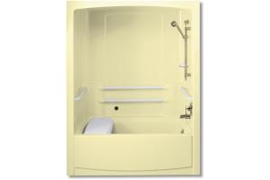 The whirlpool and shower module inside finished dimensions shall be 57" (144.8cm) in length, 36-5/8" (93cm) in width, and 80-1/2" (204.5cm) in height. Module shall be ADA compliant.Module rough-in dimensions shall be 64-3/4" (164.5cm) in length, 37" (94cm) in width, and 84" (213.4cm) in height. Module shall be made of acrylic. Module shall have a drain left or right. Module shall have 6 Flexjets, 1.5 hp variable speed pump, 1.5 kW heater, and back-lit user control. Module shall be UL Listed. Module shall be less all trim. Module shall have integral soap ledges. Module shall have nylon grab bars (-N),( grey bars supplied with White and Biscuit modules, white bars supplied with others), brushed stainless steel grab bars (-C), or polished stainless steel grab bars (-P).Module shall have a removable,multi-position seat.Module shall have a molded-in floor pattern. Module shall be Kohler Model K-12106.