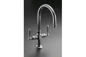 The Two-handle kitchen sink faucet shall be constructed of stainless steel. Faucet shall feature two quarter-turn washerless ceramic disc valves, assuring positive handle stop positioning. Faucet shall have feature a 7" (17.8 cm) gooseneck swing spout, 2.2 gpm (8.3 lpm) gallon flow rate, and ADA compliant lever handles. Faucet shall be for 8" (20.3 cm) centers. Faucet shall be Kohler Model K-7342-4.