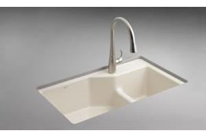 The Indio offset double basin sink offers a clean, modern look to complement any decor. The beveled edge provides a crisp aesthetic, and the Smart Divide low-profile divider increases the clearance between faucet and divider, makes it easier to fit large items into the basins, increases the ability to transfer large items between basins, and minimizes splashing by containing water lower in the basin. Included with the sink are two stainless steel bottom basin racks, a stainless steel colander, and an American Walnut cutting board that fits over the top of the sink. Constructed of durable KOHLER(R) Cast Iron, this sink is available in a wide variety of colors and features a one-hole faucet drilling.