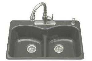 The self-rimming kitchen sink shall be 33" (83.8 cm) in length and 22" (55.9 cm) in width. Sink shall be made of cast iron with acid resistant enamel finish. Sink shall be double (equal) compartment. Sink shall be single-hole (-1), 2-hole (-2), 3-hole (-3 and -3F), 4-hole (-4), or 5-hole (-5) drilled. Sink shall include Smart Divide™ lowered divider. Sink shall be Kohler Model K-6626.