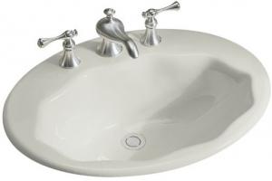 The scalloped oval self-rimming lavatory shall be 24" (61cm) in length, and 18" (45.7cm) in width. Lavatory shall be made of cast iron. Lavatory shall have 4" (10.2cm) centers (K-2908-4), 8" (20.3cm) centers (K-2908-8), or single-hole (K-2908-1) drilling. Lavatory shall be ADA compliant. Lavatory shall be Kohler Model K-2908.