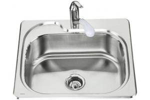 The self-rimming kitchen sink shall be 25" (63.5 cm) in width and 22" (55.9 cm) in length. Sink shall be made of 18 gauge stainless steel. Sink shall be single compartment. Sink shall be 4-hole (-4), 3-hole (-3), or single-hole (-1). Sink shall include installation hardware. Sink shall be Kohler Model K-3300