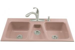 The kitchen sink shall be made of cast iron with acid-resistant enamel finish. Sink shall be tile-in. Sink shall be triple compartment with two equal basins and small center disposal basin. Sink shall be 4-hole (-4) or 5-hole (-5). Sink shall be 43" (109.2 cm) in length and 22" (55.9 cm) in width. Sink shall be Kohler Model K-5893.
