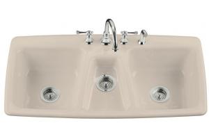 The kitchen sink shall be made of cast iron with acid-resistant enamel finish. Sink shall be self-rimming. Sink shall be triple compartment with two equal basins and smaller disposal basin. Sink shall be 4-hole (-4) or 5-hole (-5). Sink shall be 43" (109.2 cm) in length and 22" (55.9 cm) in width. Sink shall be Kohler Model K-5914.