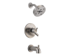 Features of the Delta T14485-SS Grail Brilliance Stainless Monitor Scald-Guard Tub & Shower Trim: D- Stainless Steel Grail Tub and Shower Universal Trim Pull-up tub spout Tub & Shower Single function pressure balance cartridge 2.5…